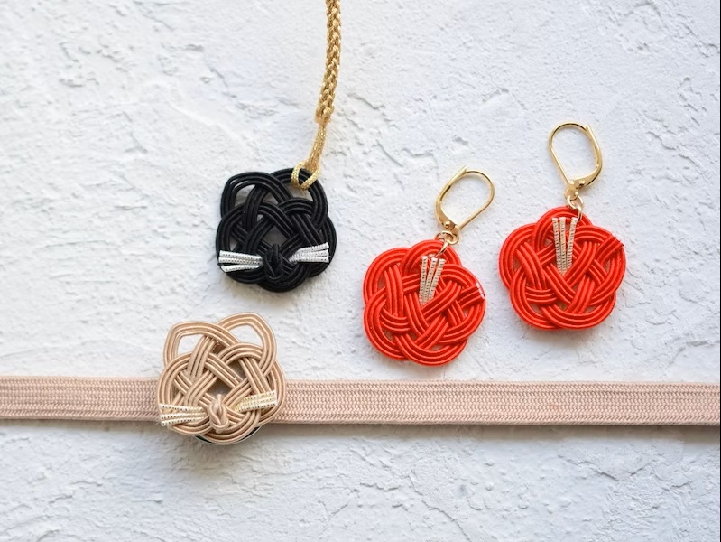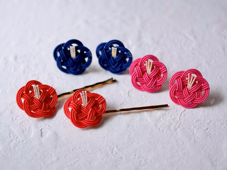 台湾の国花「梅花」をイメージした梅結び、または梅結びをアレンジした「猫」のいずれかを結び、帯留、根付、ピアス、イヤリング、ブローチのいずれかに仕上げていただきます。時間内に結びを2個作ります。